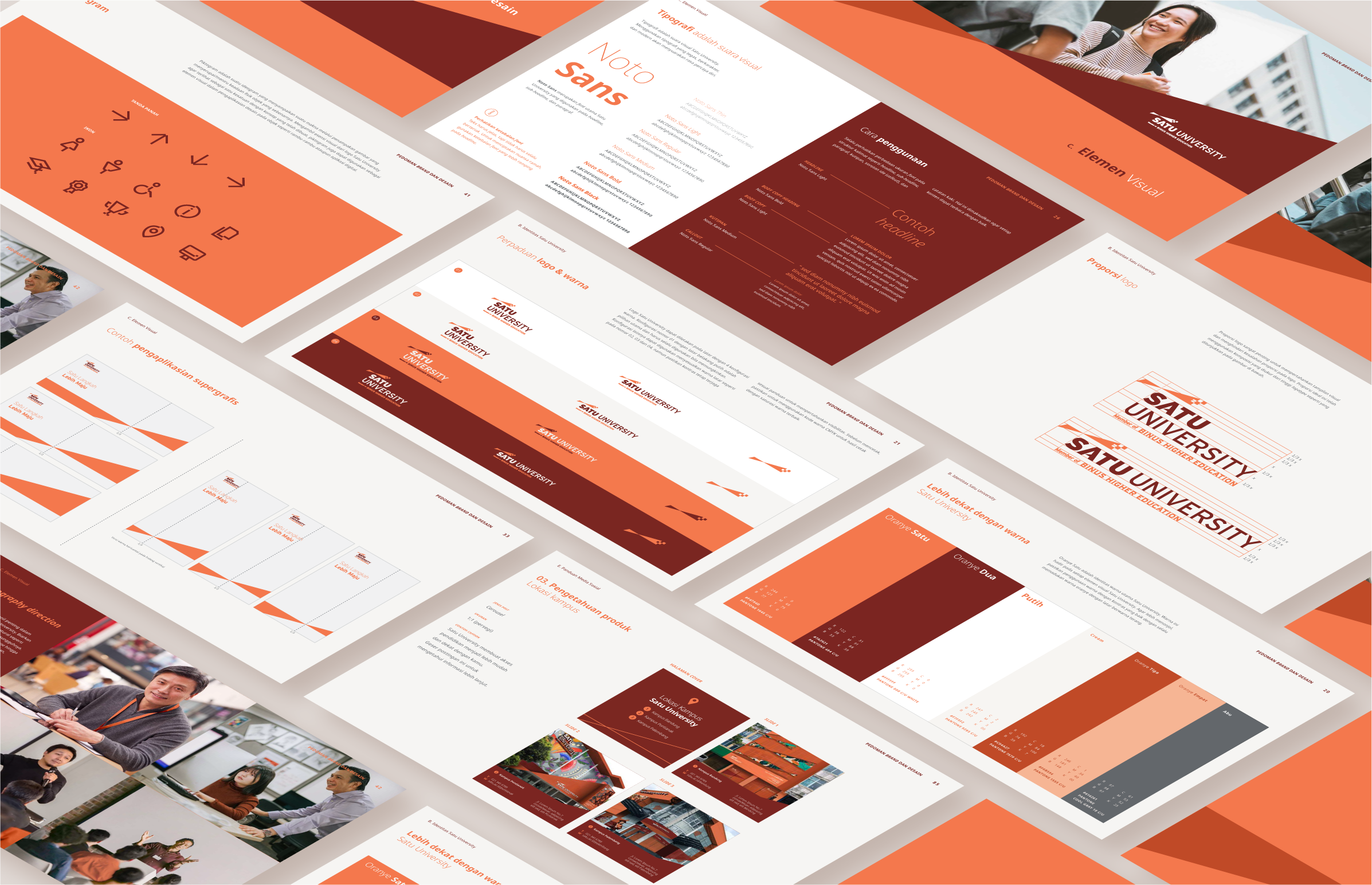 The visual elements, including the color palette, typography, and supergraphics, are designed to complement the overall visual identity. To ensure a cohesive identity, all elements are seamlessly integrated, each complementing the other for a unified and connected design.