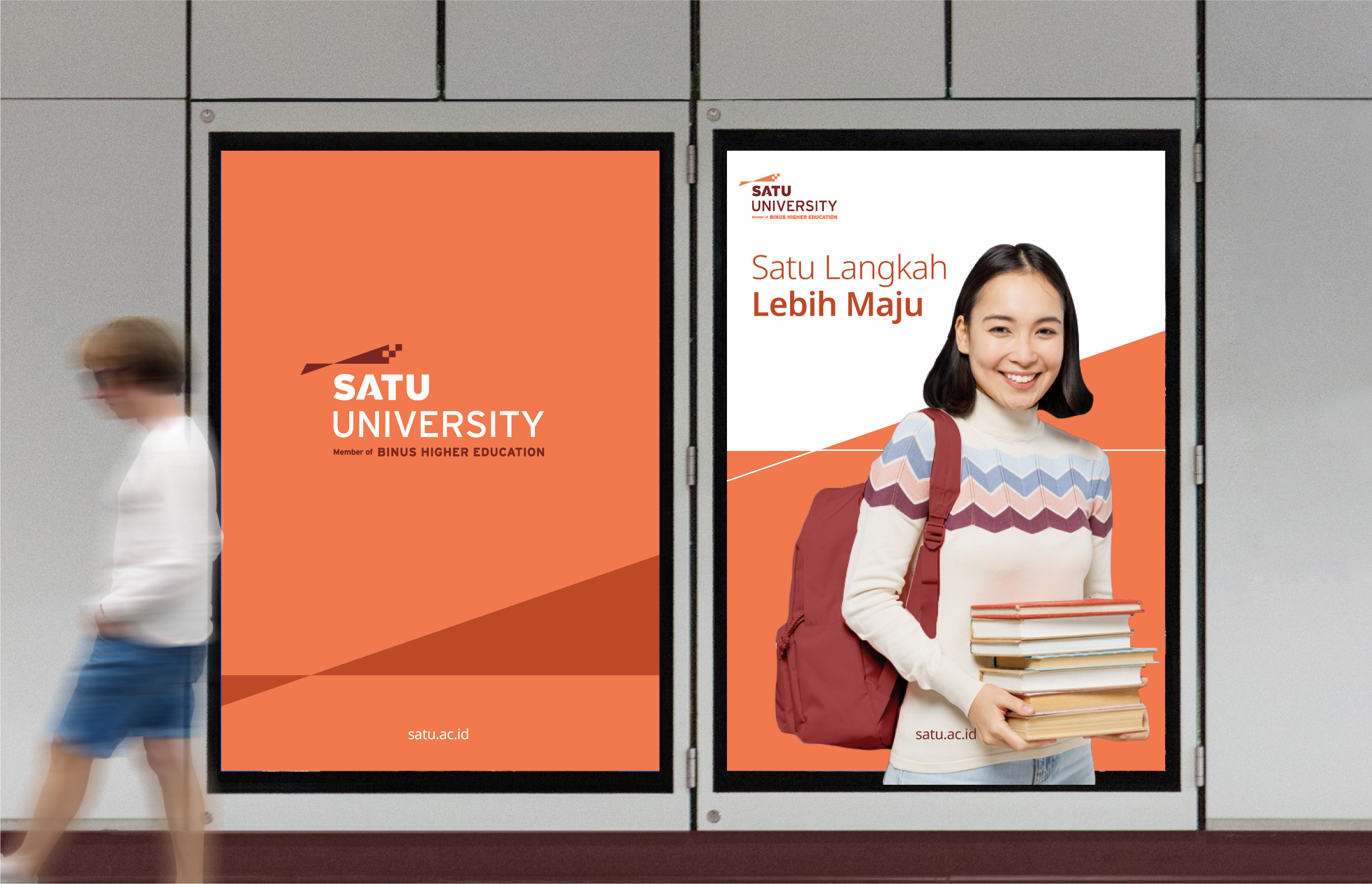 The horizontal line representing the steps, and the upward line embodying progress. The meeting point of the two lines marks the moment of educational & social experience at Satu University, while the pixel detail reflects the university’s focus on digital learning. This personal growth leads to Melangkah Lebih Maju and Bertumbuh lebih Baik.